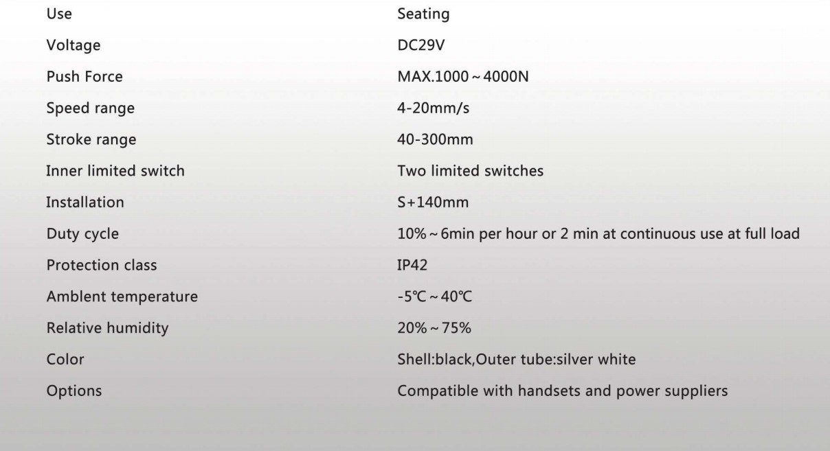 本產(chǎn)品已通過CE、UL、PSE、ISO9001認(rèn)證,它有一個新穎的外觀和制作精良,噪音小,操作簡單,讓它成為暢銷國內(nèi)外,被廣泛用于電動沙發(fā)、醫(yī)療床、手術(shù)床,按摩椅等。