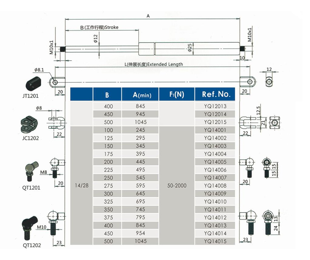 注:由于氣彈簧是非標(biāo)準(zhǔn)的,以上僅為型號(hào)的一部分。我們可以根據(jù)客戶的要求定制。